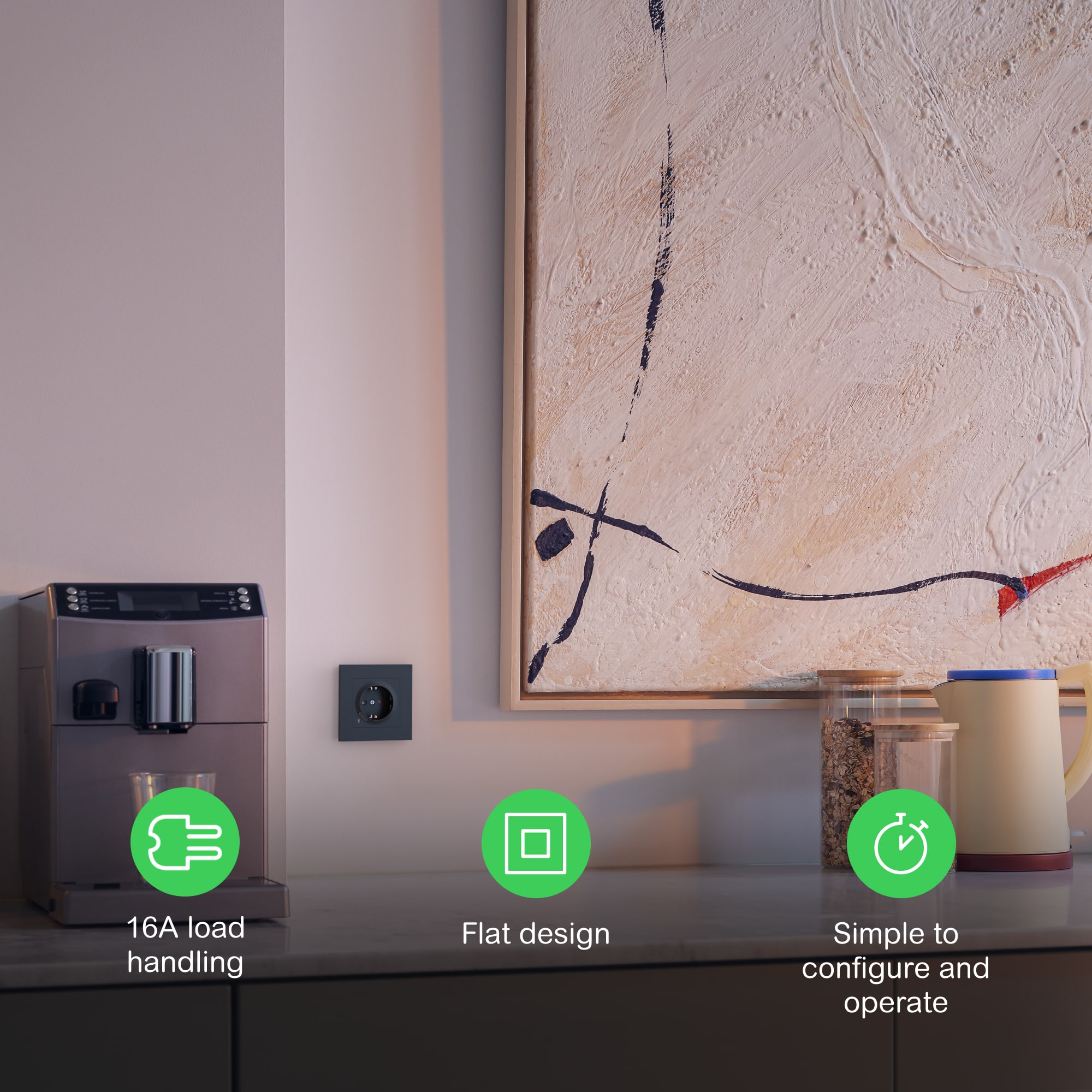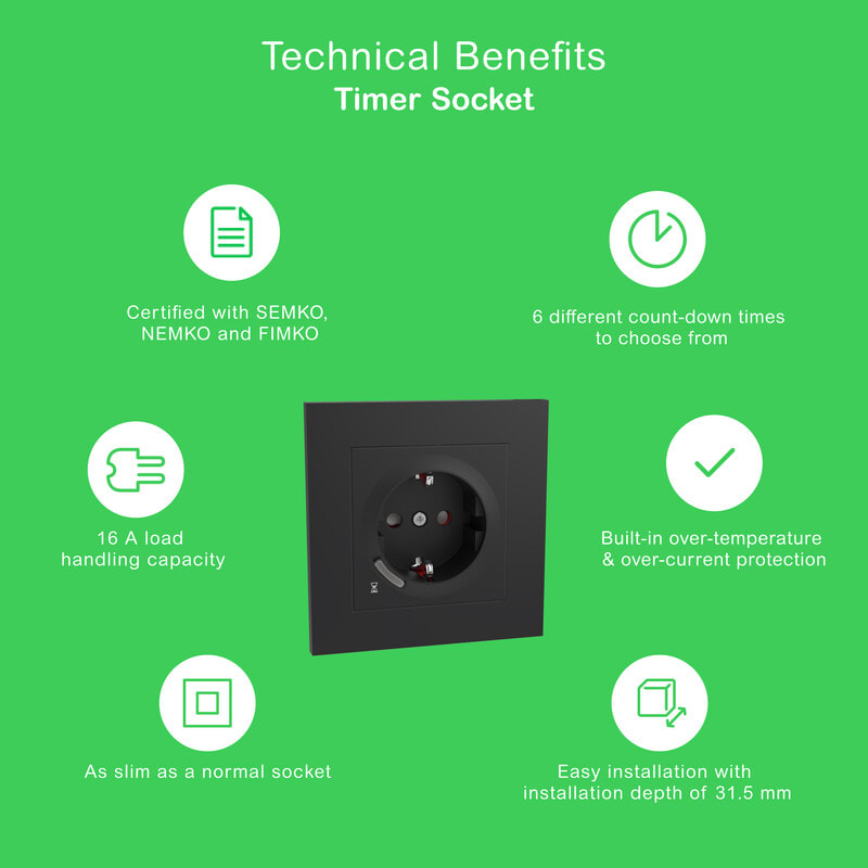 16A ajastinpistorasia integroidulla ja säädettävällä ajastimella Ajastinpistorasia on sähköpistorasia, jossa voidaan valita aikaviiveitä (15 min, 30 min, 1 h, 2 h, 4 h ja 8 h) kytkemään päälle pistorasian liitettyjä kuormia. Se toimii alas laskevana ajastimena ja on erittäin hyödyllinen tilanteissa, joissa käyttäjä haluaa kytkeä laitteen päälle rajoitetuksi ajaksi, esim. silitys, kahvinkeitin jne. Se pystyy käsittelemään kuormia jopa 16A asti. Ajastin aktivoidaan painamalla painiketta, johon syttyvä valo kertoo ajastimen olevan päällä. Eri laskenta-ajat esiasetetaan helposti painamalla samaa painiketta yksinkertaisen asennusohjeen mukaisesti.