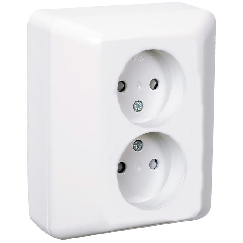 Pinta-asennettava 2-pistorasia kuiviin tiloihin. 0-luokka. Toimitetaan täydellisenä pinta-asennuskoteloineen.Voidaan asentaa kojerasian päälle pinta-asennuksena tai suoraan seinään. Asennus kojerasian päälle mahdollistaa kaapeloinnin jatkamisen pinta-asennuksena. 16A, 250V, ruuviliittimin.