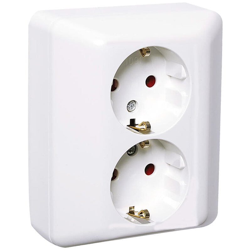 Pinta-asennettava 2-pistorasia kuiviin tiloihin. Toimitetaan täydellisenä pinta-asennuskoteloineen.Voidaan asentaa kojerasian päälle pinta-asennuksena tai suoraan seinään. Asennus kojerasian päälle mahdollistaa kaapeloinnin jatkamisen pinta-asennuksena. 16A, 250V, ruuviliittimin.