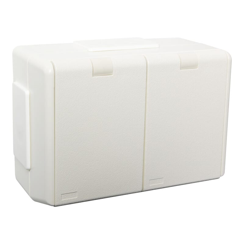 Kosteisiin tiloihin soveltuvan IP44 pistorasian kannet ovat kestävät ja kääntyvät kokonaan taakse.