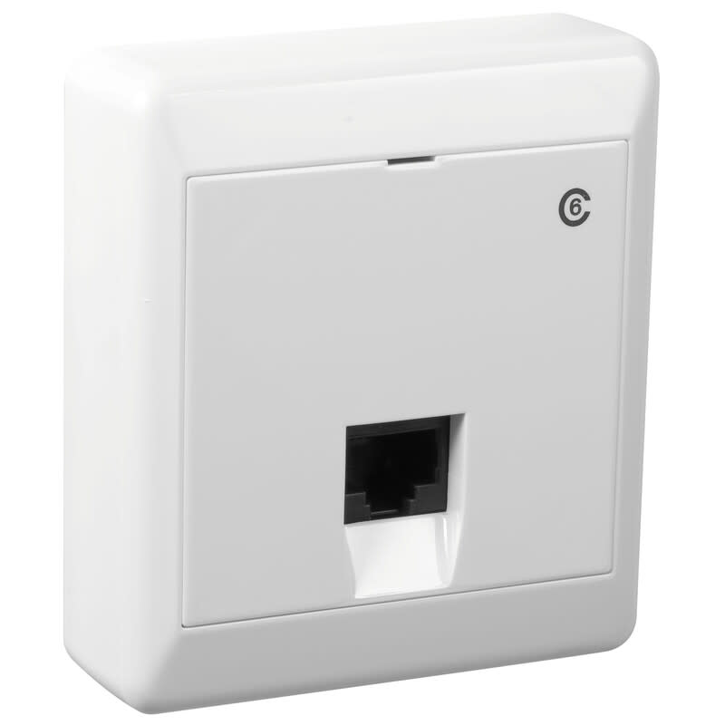 Pinta-asennettava K6 pistorasia, nousee vain 27 mm seinästä. Kytkentä LSA+ liitäntärimoihin. EIA/TIA -mukainen värimerkintä. Väri: valkoinen.