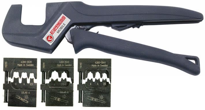 Mobile-käsipihdit, joiden mukana toimitetaan kolmet vaihdettavat leuat ja LOKE-kuorintatyökalu erikoispaksulla eristeellä varustettujen aurinkopaneelien kuorintaan.