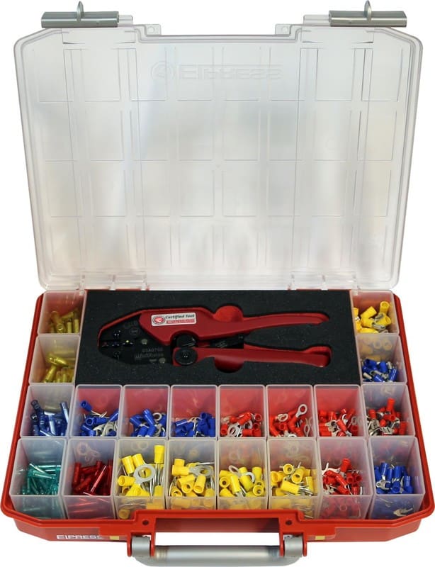- 600 kpl Elpressin eristettyjä liitoksia 0,5-6 mm²: rengaskaapelikenkiä, haarukkaliittimiä, eristettyjä jatkosholkkeja, lattaliittimiä (uros ja naaras), laattapistokehylsyjä ja pyöröpis- tokeliittimiä.
