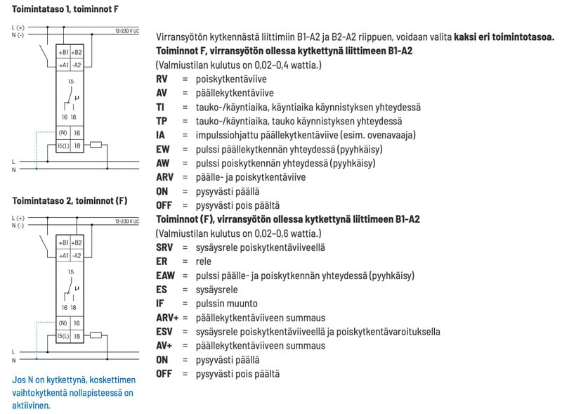 - Virransyötön kytkennästä liittimiin B1-A2 ja B2-A2 riippuen, voidaan valita kaksi eri toimintotasoa.