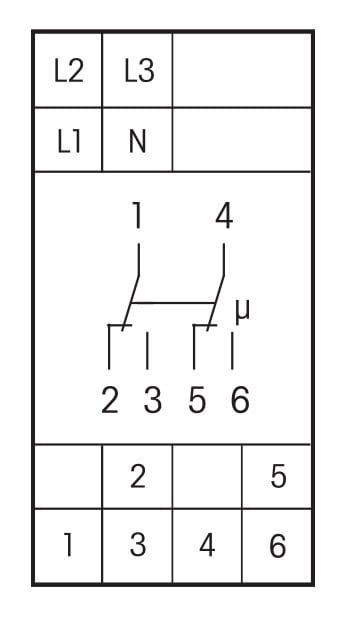 Käyttöjännite L1-N 180-250V/50 Hz. Jos L1:ssä tulee jokin vika, rele katkaisee virran välittömästi. Alemmalla kiertokytkimellä voidaan valita kahden päälle- ja poiskytkentäjännitteen välillä sekä valvottavien vaihejohtimien lukumäärä.