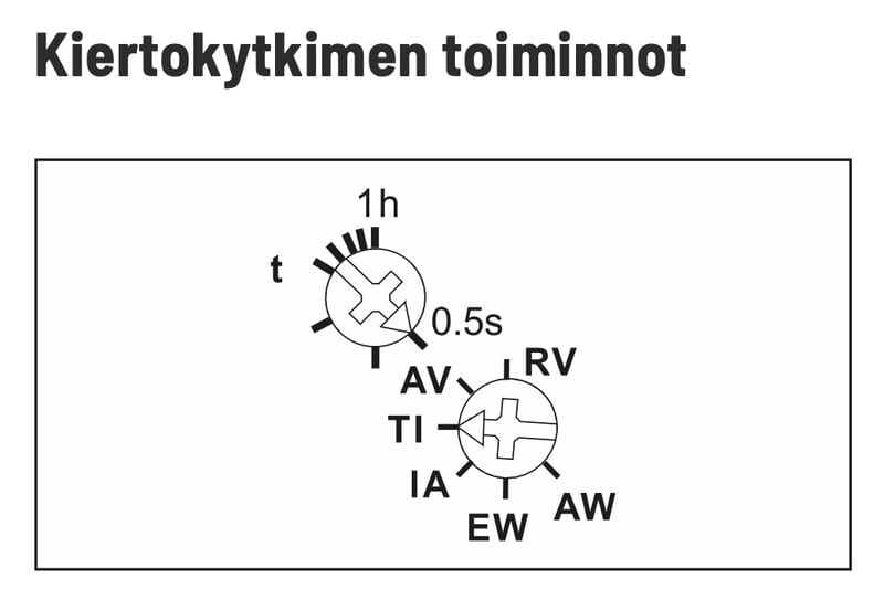 Aika-asetukset säädettävissä 0,5 sekunnista 1 tuntiin.