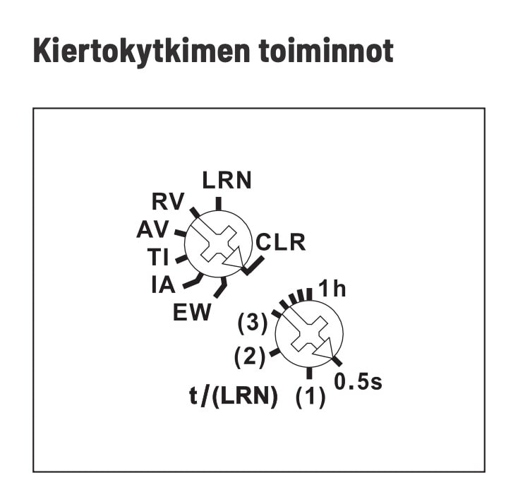- Alemmalla kiertokytkimellä, aika-asetukset säädettävissä 0,5 sekunnista 60 minuuttiin.