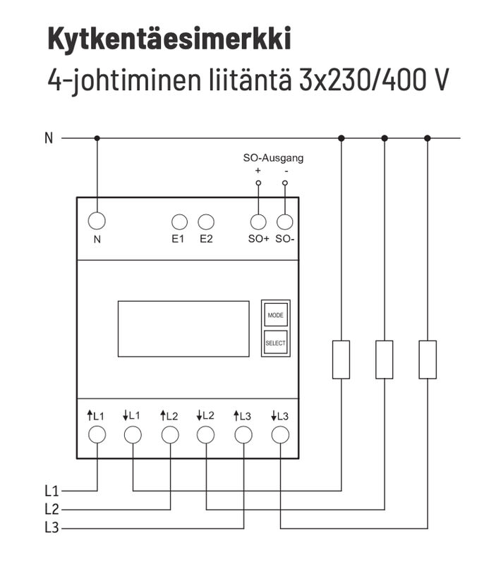 - 1-, 2- tai 3-vaihejohtimet joiden virta on maksimissaan 80A, voidaan kytkeä mittariin.