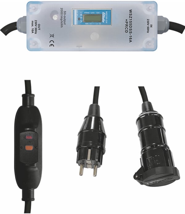 Siirrettävä 1-vaihe energiamittari Schuko (Type F) uros ja naaras pistokkeilla ja vikavirtasuojakytkimellä. MID-hyväksytty. IP54. Siirrettävä 1-vaihe energiamittari Schuko (Type F) uros ja naaras pistokkeilla sekä vikavirtasuojakytkimellä (PRCD) 30 mA.
