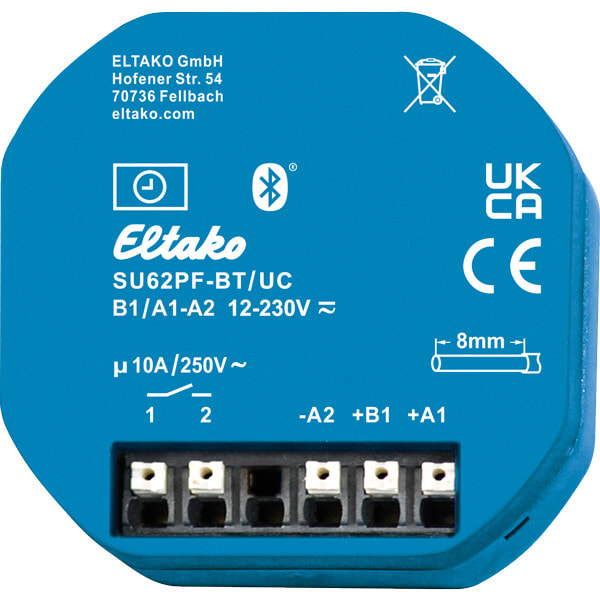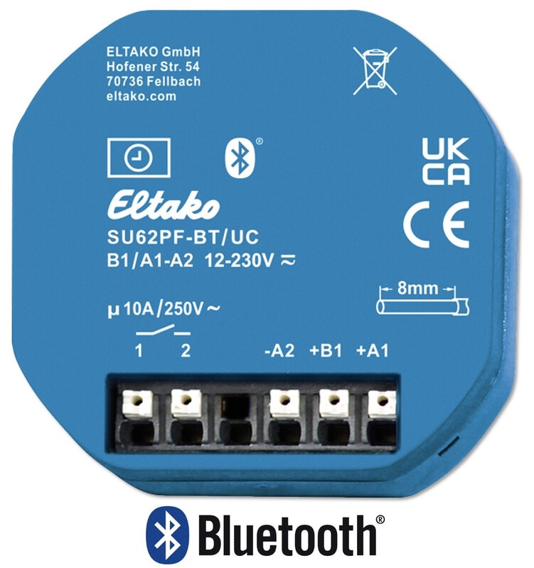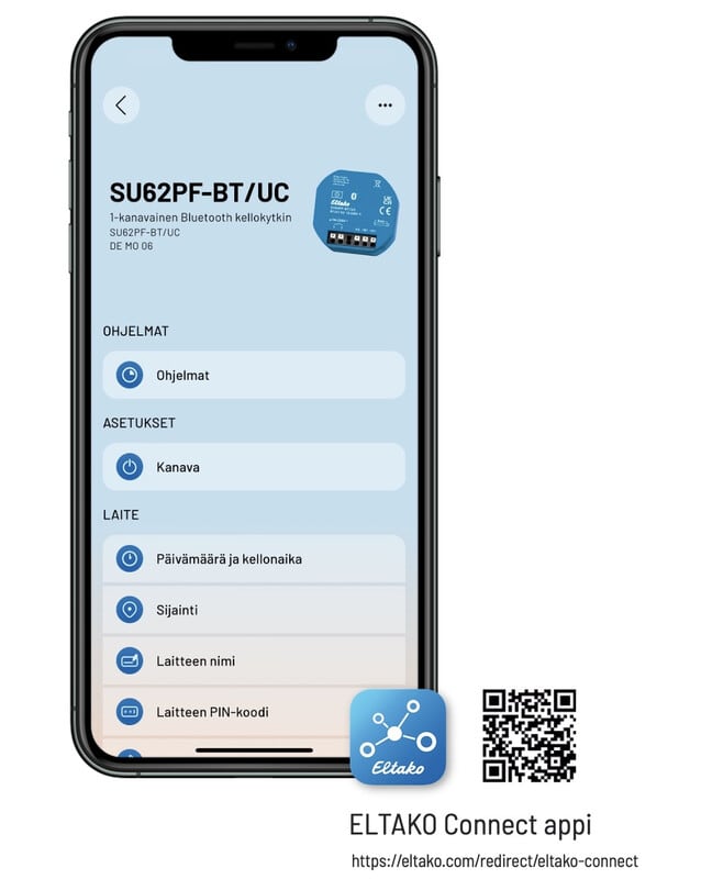 Kellokytkimen ajastintoiminnot ja aika-asetukset asetettavissa ilmaisen suomenkielisen Eltako Connect appin kautta. Suora Bluetooth yhteys kellokytkimestä älypuhelimeen.