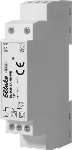Kompakti relemoduuli 230V kuormien suoraan DALI ohjaamiseen. Kuormat ilman DALI-tuloa on helppo integroida DALI-piiriin. Kuormat voidaan kytkeä päälle/pois DALI-komennoilla. Laiteen toiminta on yhteensopiva DALI Device Type 7 - standardin mukaisella kytkentätoiminnolla (Firmware 2.0). Säädettävä ominaisuus virran kytkemiseen ja väylän virtakatkoon. DALI RM16 saa virran DALI-väylän kautta. Ylimääräistä virtalähdettä ei tarvita. Nollapistekytkennällä. Integroitu käynnistysvirran raja-arvo, sopii erityisesti kuormille, joilla on erittäin suuri käynnistysvirta (>100A). Relemoduuli toimii väylälaitteena (bus user) ja sille voidaan siksi antaa osoite. Konfigurointi DALI Cockpit PC -ohjelmiston kautta.