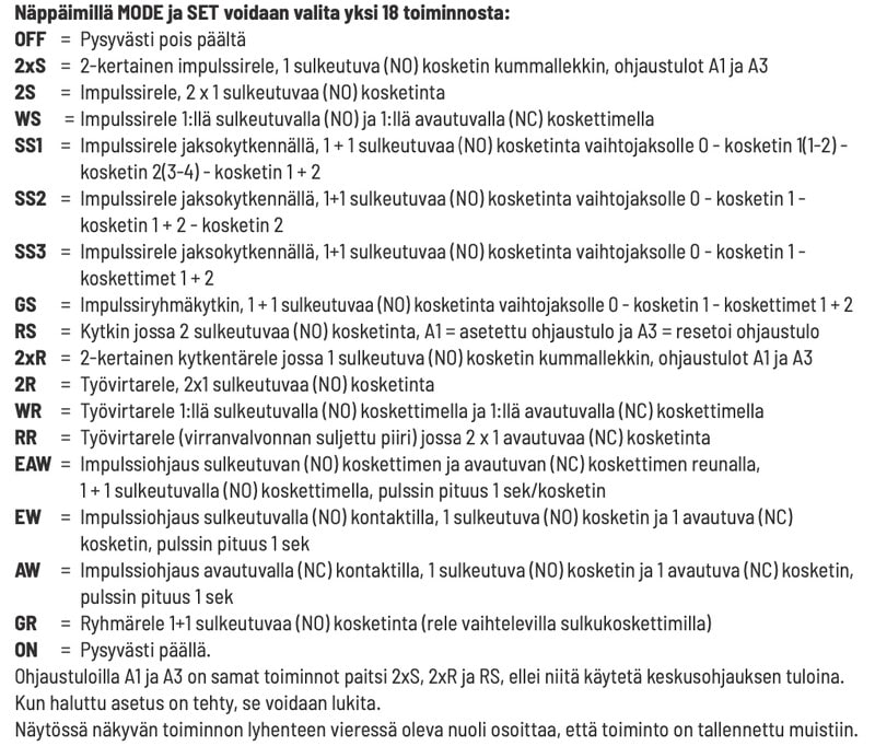Valittavana 18 eri rele- ja kosketintoimintoa.