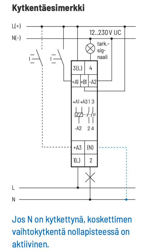 - Yleinen ohjausjännite 12-230V AC/DC. Käyttöjännite on sama kuin ohjausjännite.