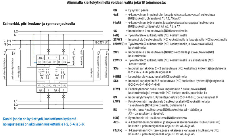 4-kanavainen impulssirele työvirtarele toiminnolla. Myös keskus- ja ryhmäohjaus.
