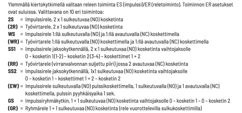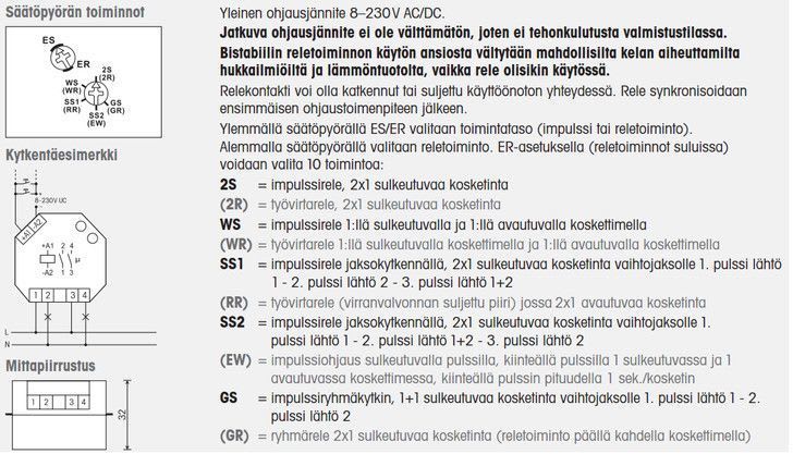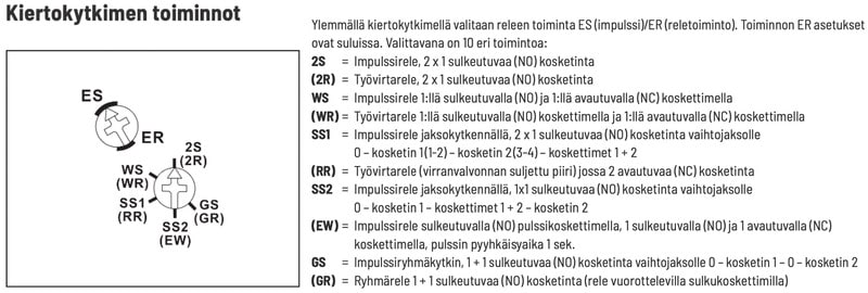 - Ylemmällä kiertokytkimellä valitaan releen toiminta ES (impulssirele)/ER (työvirtarele).
