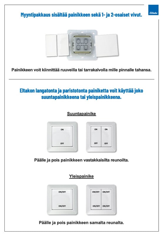 Langattomat ja paristottomat painikkeet voit yhdistää mihin tahansa ELTAKOn langattomiin releisiin ja valonsäätimiin. Painikkeet voidaan opettaa toimimaan joko kytkimen tyylisesti (päälle/pois painikkeen vastakkaisilta puolilta) tai painikkeen tyylisesti (päälle/pois painikkeen samalta puolelta). Yhden painikkeen voi yhdistää myös useampaan vastaanottimeen kerralla.