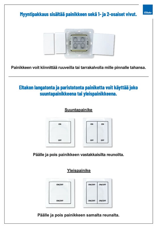 Langattomat ja paristottomat painikkeet voit yhdistää mihin tahansa ELTAKOn langattomiin releisiin ja valonsäätimiin. Painikkeet voidaan opettaa toimimaan joko kytkimen tyylisesti (päälle/pois painikkeen vastakkaisilta puolilta) tai painikkeen tyylisesti (päälle/pois painikkeen samalta puolelta). Yhden painikkeen voi yhdistää myös useampaan vastaanottimeen kerralla.