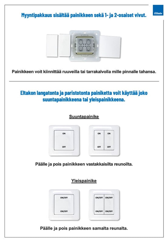 Langattomat ja paristottomat painikkeet voit yhdistää mihin tahansa ELTAKOn langattomiin releisiin ja valonsäätimiin. Painikkeet voidaan opettaa toimimaan joko kytkimen tyylisesti (päälle/pois painikkeen vastakkaisilta puolilta) tai painikkeen tyylisesti (päälle/pois painikkeen samalta puolelta). Yhden painikkeen voi yhdistää myös useampaan vastaanottimeen kerralla.