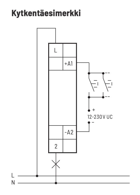 - Yleinen ohjausjännite 12-230V AC/DC, galvaanisesti eristetty kytkentäjännitteestä.