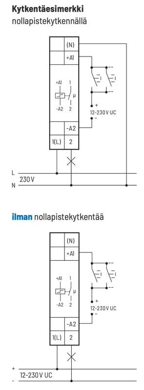 - Yleinen ohjausjännite 12-230V AC/DC.
