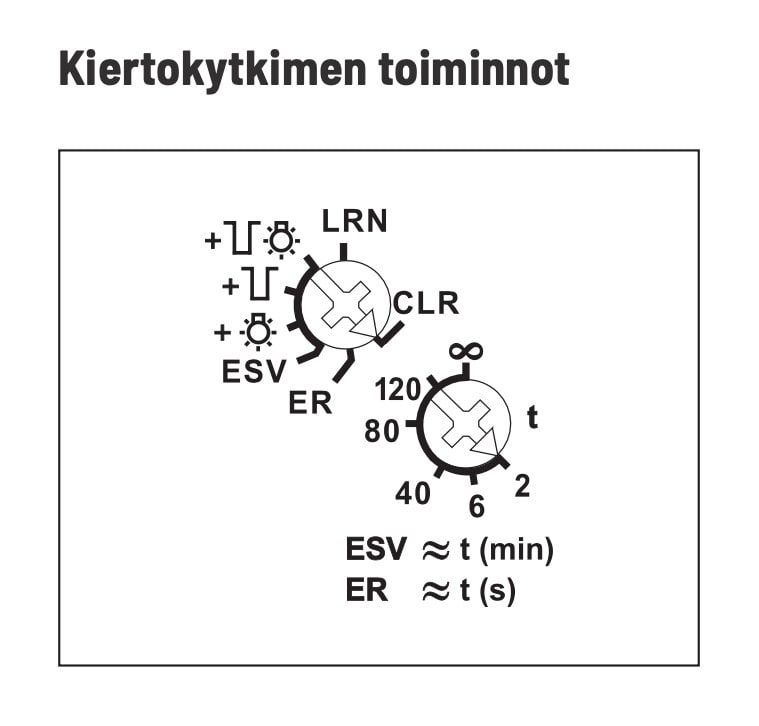 ESV - Impulssirele esimerkiksi valaistuksen päälle/pois kytkentään, tarvittaessa voidaan alemmalla kiertokytkimellä asettaa poiskytkentäviive välillä 2-120 minuuttia.