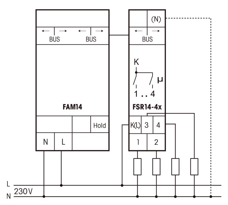 - 4-kanavainen impulssirele integroidulla reletoiminnolla, 1 sulkeutuva (NO) kosketin per kanava 4A/250V AC