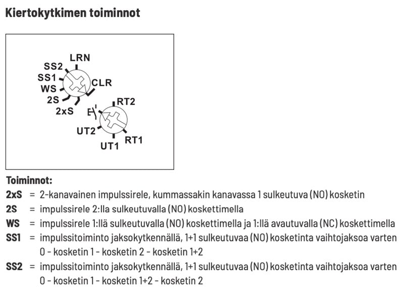 SS2 = Impulssitoiminto jaksokytkennällä,1+1sulkeutuvaa(NO) kosketinta vaihtojaksoa varten, 0 - kosketin 1 - kosketin 1+2 - kosketin 2.
