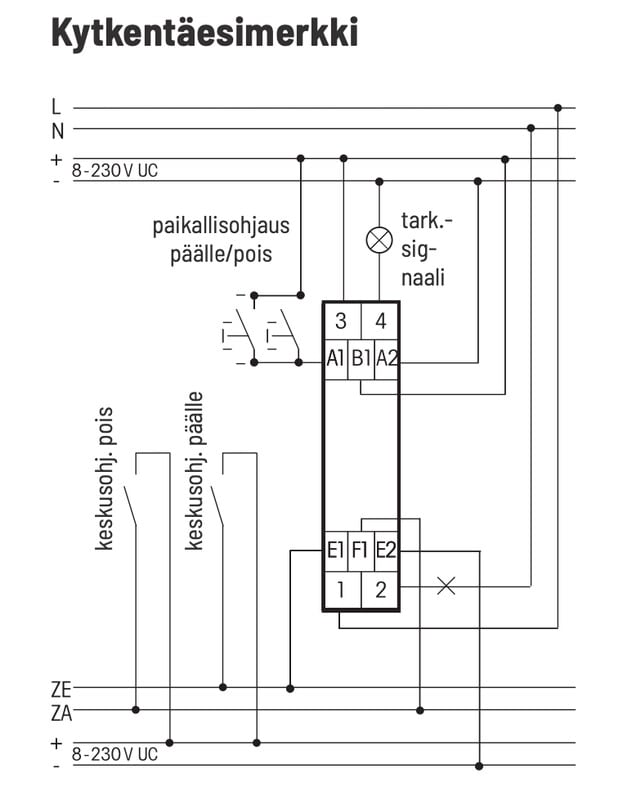 - Keskusohjauksen tulot 8-230V AC/DC. Keskusohjauksen PÄÄLLE ja POIS kytkennän tulot on galvaanisesti erotettuja paikallisista yleisistä ohjaustuloista. Käyttöjännitteen on oltava sama kuin ohjausjännitteen.