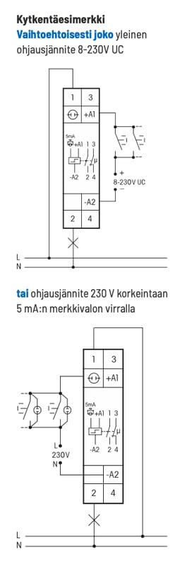 - Vaihtoehtoisesti yleinen ohjausjännite 12–230V AC/DC tai 230V korkeintaan 5mA:n merkkivalon virralla, kytkentäohjeen mukaisesti.