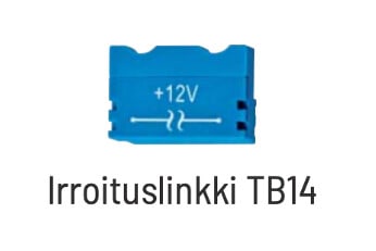 Toimitukseen kuuluu 1 irrotuslinkki TB14 1-moduulin levyinen, 1 jumpperi 1,5 -moduulin levyinen ja välikappale DS14.