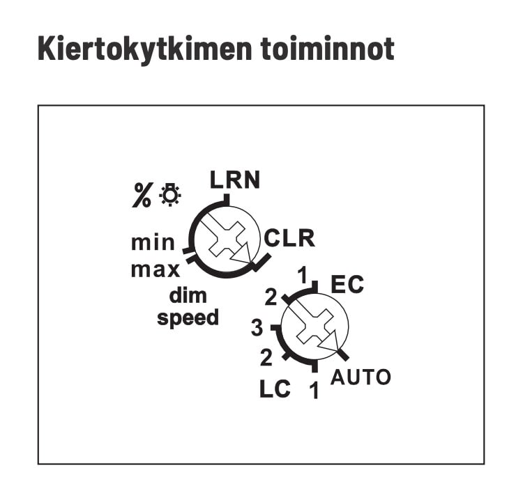 • Käyttötilat LC1, LC2, LC3 (etureuna/nouseva reuna/leading edge), himmennettäville 230V LED-lampuille, joita ei voida himmentää halutulla tavalla AUTO-tilassa, lisäksi himmennettävien 230V LED-lamppujen kokonaismäärä voi olla alhaisempi kuin AUTO-tilassa riippuen elektroniikan rakenteesta.