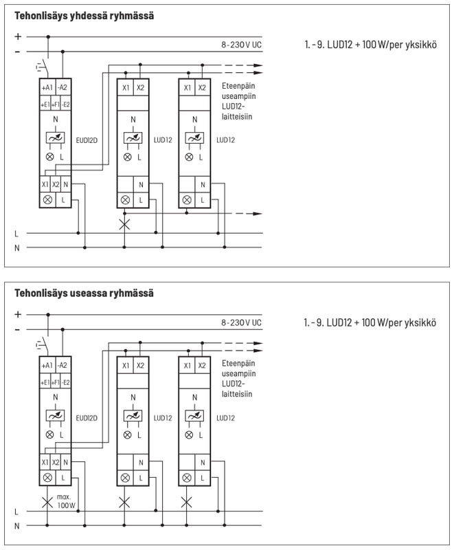 Tehoyksikön avulla voidaan kasvattaa yleishimmentimien LED-kuormankestoa tarvittaessa 100W per yksi LUD12-230V tehoyksikkö. Tehoyksiköitä voi myös kytkeä maksimissaan 9 kpl peräkkäin ja näin ollen kasvattaa LED-kuormankesto jopa 900W asti.
