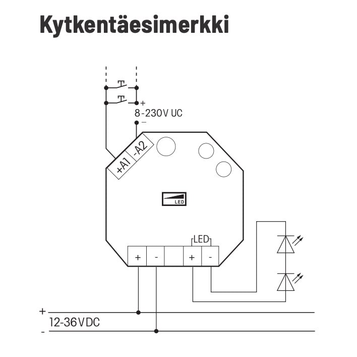 Pulssin kestävä tasavirtalähde yksikkö, joka antaa tarvittavan jännitteen ja vaaditun LED-valon (-valojen) virran, tarvitaan. Yleinen ohjausjännitetulo 8 - 230V UC, galvaanisesti eristetty 230V:n syöttöjännitteestä ja kytkentäjännitteestä.