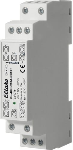 Suunniteltu ohjaamaan vakiojännitteisiä LED-moduuleja (CV) käyttöjännitteillä 12V - 48V, käyttötapa DT6: erillinen kanavien ohjaus 3 DALI-osoitteen kautta.