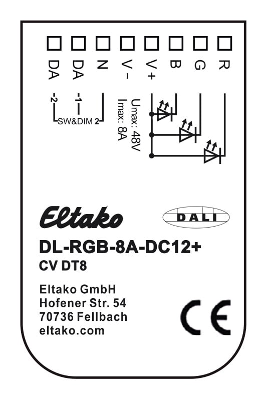 Suunniteltu ohjaamaan vakiojännitteisiä LED-moduuleja (CV) käyttöjännitteillä 12V - 48V, käyttötila DT8: DALI-osoite kirkkauden ja värin säätämiseen DALI DT8, tyyppi RGBWAF.