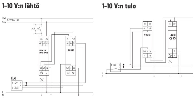 Näitä himmentimiä ohjataan jousipalautteisella kytkimellä, joka on kytketty yleiseen jännitetuloon paikallisesti tai keskusohjattavasti. SUD12 muuntaa himmentimen painikkeen signaalin liittimistä Y1/Y2 analogiseksi 1-10 voltin signaaliksi lähtöön 0/Q1.