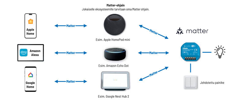 Matterin kautta sovelluksella ohjaamiseen tarvitaan oma yhteensopiva Matter-ohjain, jokaiselle ekosysteemille erikseen. Apple Homelle esimerkiksi HomePod mini, Amazon Alexalle esimerkiksi Echo Dot ja Google Homelle esimerkiksi Nest mini. Uusien laitteiden yhdistäminen älykotijärjestelmään on helppoa standardoidun Matter QR-koodin avulla.