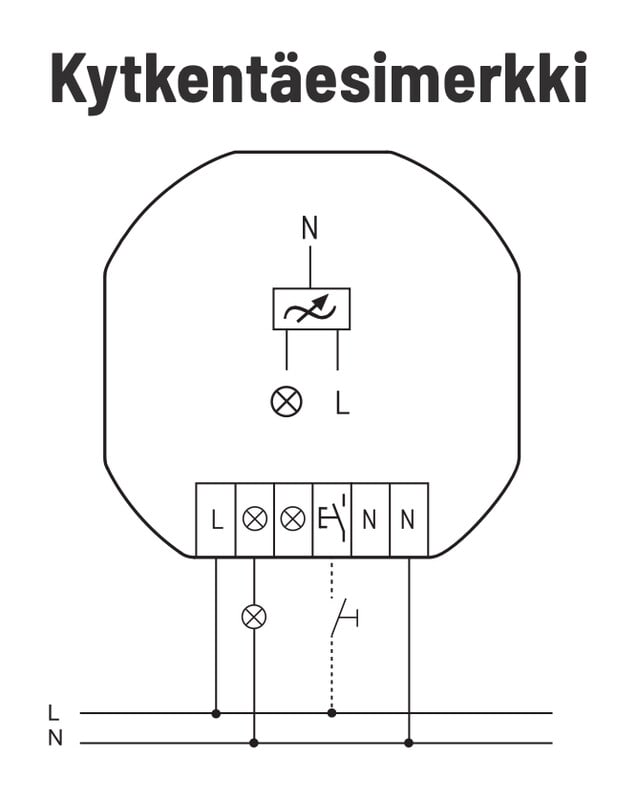 Yleishimmennin WiFi. Matter-sertifioitu, REST-API. 230V laskevan reunan LED-kuorma enintään 300W ja nousevan reunan 100W, hehkulamppukuorma enintään 300W. Valmiustilan kulutus vain 0,9 wattia. Ei minimikuormaa. WiFi yleishimmennin. Matter -sertifioitu ja REST-API.
