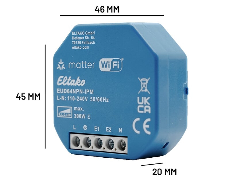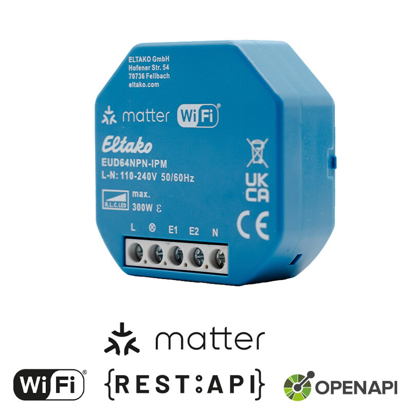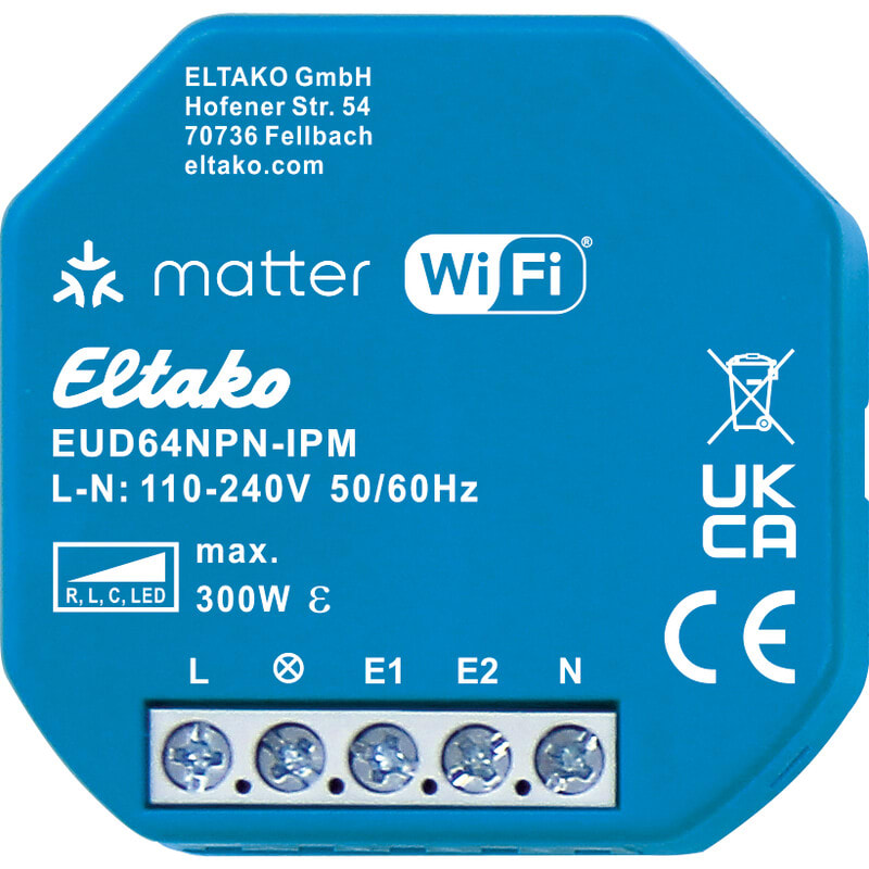 Yleishimmennin, Matter Wi-Fi:n kautta. LED- ja hehkulamppukuorma korkeintaan 300W. Minimikuormaa ei tarvita. Toiminnot laajennettavissa langattomalla EnOcean plug-in adapterilla (EOA64). Matter-sertifioitu yleishimmennin. Himmennintä voidaan ohjata millä tahansa Matter-yhteensopivalla sovelluksella suoraan Wi-Fi:n kautta. (esim. Apple Home, Home Assistant, Google Home, Amazon Alexa). Ilmaisella ja suomenkielisellä ELTAKO Connect-appilla, voit muuttaa laitteen asetuksia ja konfigurointia.