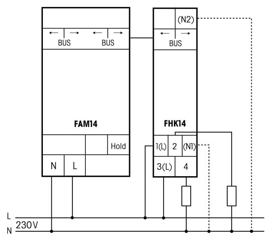 Langattomien toimilaitteiden DIN-kisko asennukseen, tarvitaan aina vähintään yksi FAM14-antenni- moduuli jonka rinnalle asennetaan muut tarvittavat toimilaitteet. Langaton antennimoduuli FAM14 vastaanottaa vastaanottoalueellaan kaikki erilaisista painikkeista, sensoreista, vahvistimista ym. tulevat langattomat signaalit ja nämä signaalit välitetään edelleen RS485-liitännän kautta sarjaan kytkettyihin muihin RS485-väylän toimilaitteisiin: Eltakon RS485-väylään voidaan kytkeä jopa 126 kanavaa. Virransyöttö ja data muihin väylän laitteisiin FAM14:sta eteenpäin kulkee yläreunan jumpperiliittimien kautta.