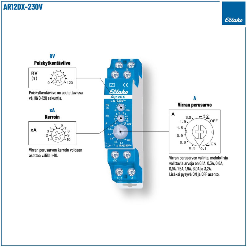 Laitteen sisäisen rengassydänmuuntajan avulla, kytkentäkuvassa olevan laitteen V1 (liittimet M1-M2) läpi kulkevaa vaihtovirtaa verrataan releen asetettuun arvoon, joka on asetettavissa kiertokytkimillä A (virran perusarvo) ja xA (kerroin) asteikolla 0,1–32A.