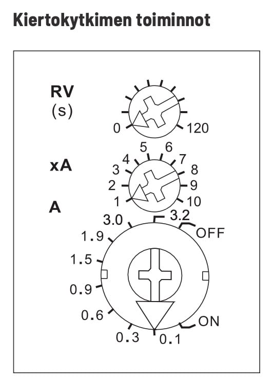 Virran perusarvo A asetetaan alimmalla kiertokytkimellä A. Mahdollisia perusarvoja ovat 0,1A; 0,3A; 0,6A; 0,9A; 1,5A; 1,9A; 3,0A ja 3,2A.