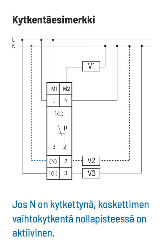 Mikäli asetettu arvo ylittyy, rele kytkee pois laitteen V2 (kytketty liittimeen 2) tai vaihtaa laitteeseen V3 (kytketty liittimeen 3) 0,5 sekunnin kuluessa.