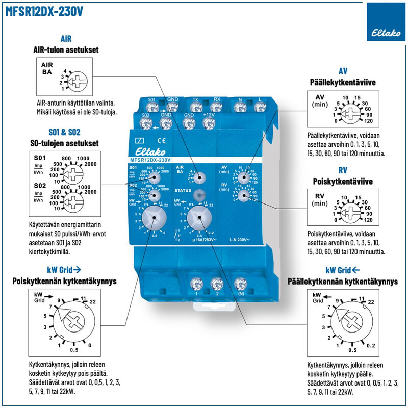Kun energiansyötön asetettu tehoarvo (←) saavutetaan, alkaa päällekytkentäviive (AV), joka voidaan asettaa välillä 0, 1, 3, 5, 10, 15, 30, 60, 90, 120 minuuttia, kiertokytkimellä (AV). Kiertokytkimen (AV) alla oleva punainen LED-merkkivalo vilkkuu niin kauan, kuin AV-aika on käynnissä. AV-ajan päätyttyä, releen kosketin kytkeytyy päälle, jos asetettu teho (kW) ei ole jälleen pudonnut asetetun kytkentärajan alapuolelle. Punainen TILA LED-merkkivalo palaa niin kauan. kuin releen kosketin on kiinni.