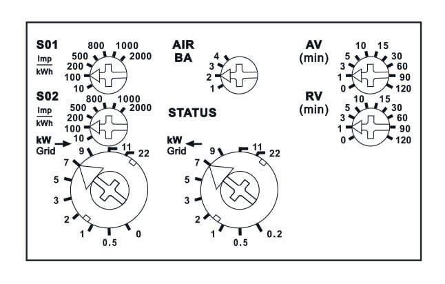 Kytkentäkynnys, jolloin releen kosketin kytkeytyy pois päältä, asetetaan alarivin kiertokytkimellä (kW Grid →). Tällä säädettävät tehon arvot ovat 0, 0,5, 1, 2, 3, 5, 7, 9, 11, 22 kW.
