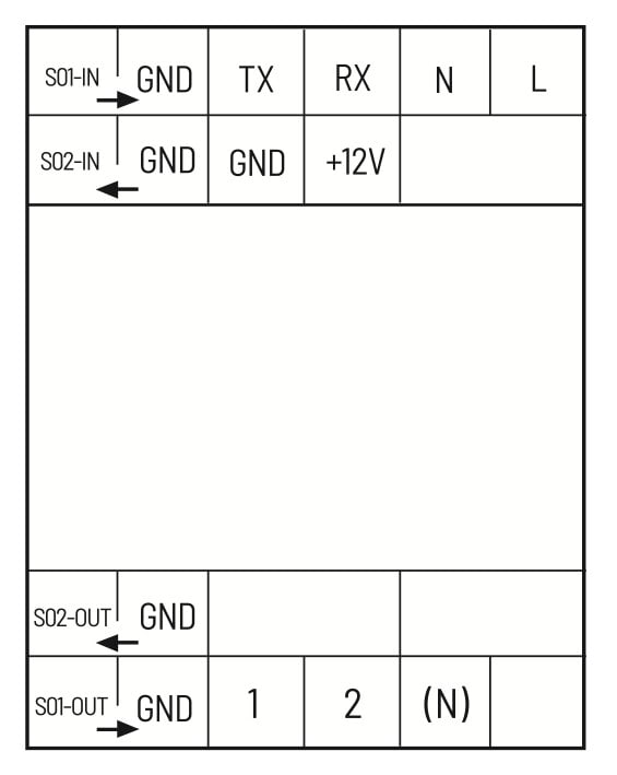 S0-tulot, S01 (kulutettu sähkö →) ja S02 (tuotettu sähkö ←). Käytettävän energiamittarin mukaiset S0 pulssit/kWh, asetetaan niitä vastaavilla S01 ja S02 kiertokytkimillä. Näillä säädettävät arvot ovat 10, 100, 200, 500, 800, 1000, 2000 Imp/kWh.