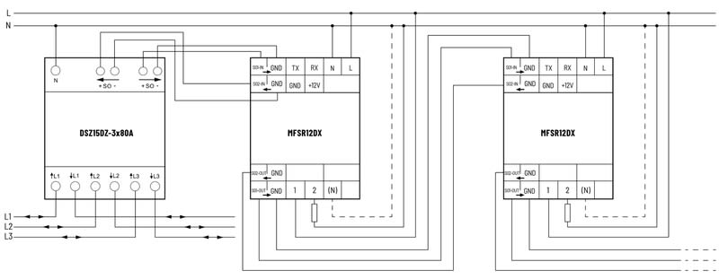 Näiden liittimien avulla voidaan tarvittaessa ketjuttaa jopa kymmenen muuta MFSR12DX-230V monitoimivirtarelettä, jotta voidaan käyttää useita eri kytkentäkynnyksiä.