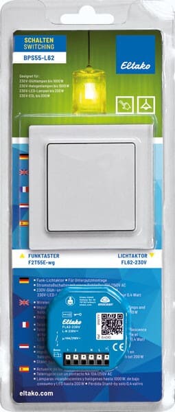 Langaton blisteripaketti päälle/pois kytkentään, joka sisältää langattoman ja paristottoman F2T55E-wg painikkeen ja langattoman FL62-230V impulssireleen. Langaton blisteripakattu tuotepaketti päälle/pois kytkentään, joka sisältää langattoman ja paristottoman F2T55E-wg painikkeen ja langattoman FL62-230V impulssireleen.