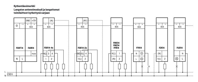 Langattomien toimilaitteiden DIN-kisko asennukseen, tarvitaan aina yksi FAM14-antennimoduuli jonka rinnalle asennetaan muut tarvittavat toimilaitteet. FAM14 vastaanottaa langattomat signaalit ja välittää ne eteenpäin RS485-väylää pitkin.
