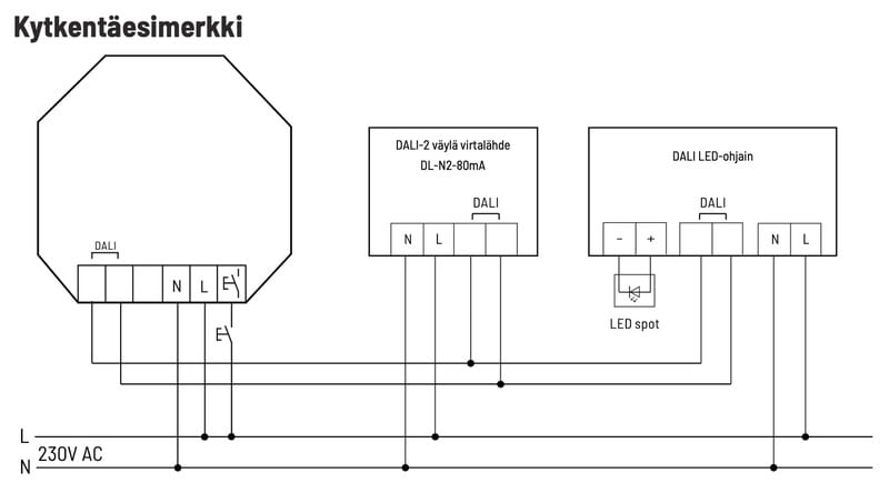 - DALI-väylän virtalähde DL-N2-80mA ja maksimissaan 40 DALI-laitetta kytketään DALI-liittimiin.
